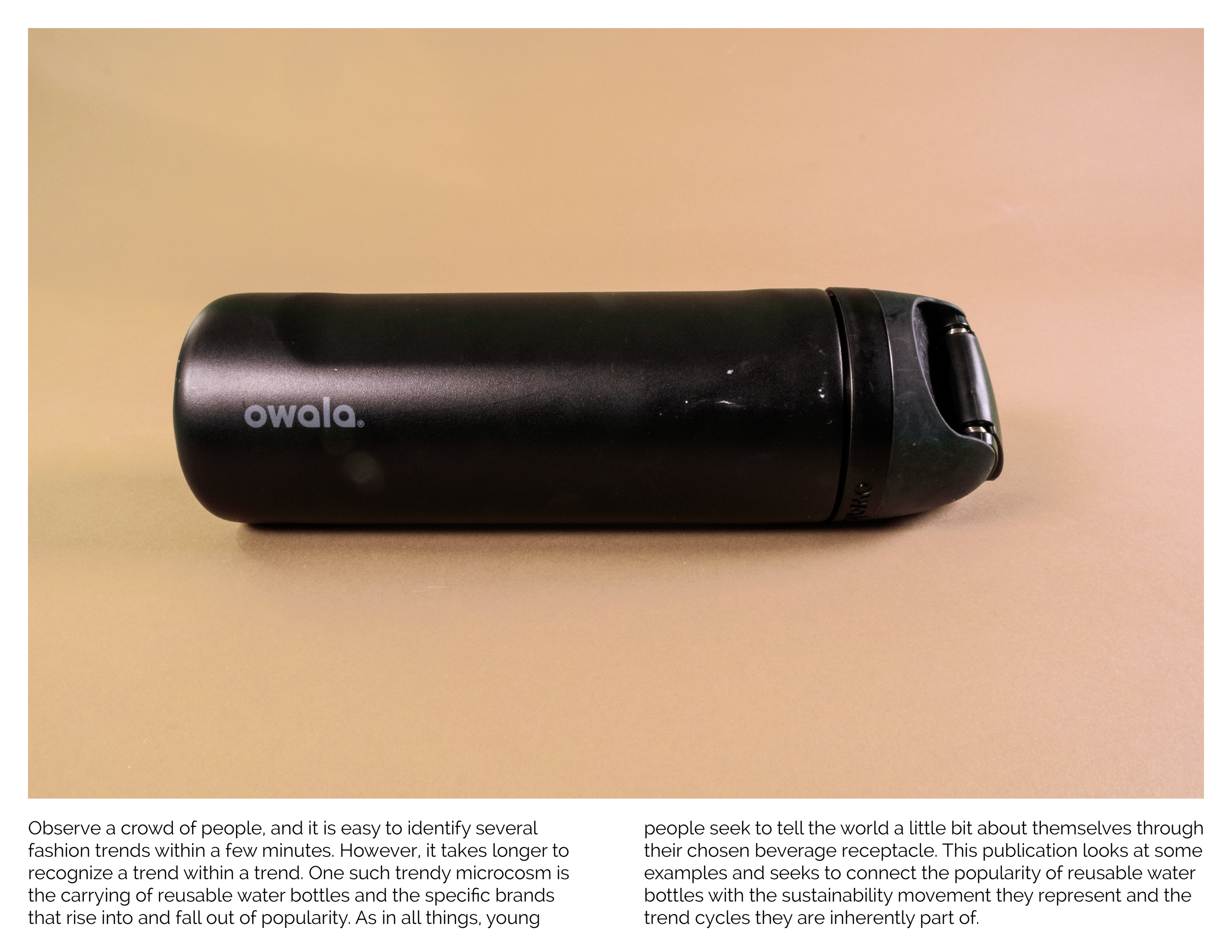 Bottle Models is a photo book that uses curated and candid photographs of reusable water bottles and contextualizes them with information and thoughts about self expression, sustainability, and trend cycles.